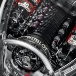 On dévoile donc la MP-05 Sapphire LaFerrari, une suite à la « simple » MP-05 LaFerrari. Comme son nom l’indique, cette nouvelle montre adopte le saphir comme matière première. On compose la montre dans un boitier fabriqué à partir de sept pierres de saphir. La sculpture demande pas moins de 600 heures travail suivant une conceptualisation de 18 mois par l’horloger. Au compte, on utile pas moins de 637 pièces pour assurer la cadence en tourbillon de la montre. Comme le souligne la communication de Hublot, on retrouve le sentiment que le mouvement se fait comme si les cadrans étaient suspendus dans l’air. Concernant le bracelet, on propose la silicone transparente pour ne pas faire ombrage à la beauté du boitier.
