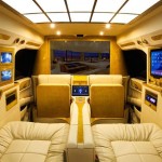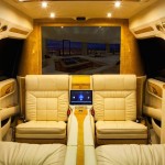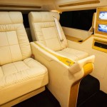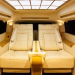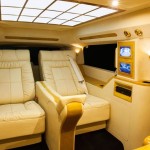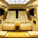 Le véhicule que l’entreprise nous présente aujourd’hui à l’air tout à fait normal en version allongée ESV. Il suffit toutefois d’ouvrir l’une des portières pour atteindre une cabine qui n’a d’égale que le Château de Versailles. Entièrement reconfiguré, on découvre que l’ensemble de l’œuvre est réaménagé. La banquette est repoussée vers l’arrière pour permettre aux fauteuils inclinables un plus grand dégagement. Pour les occasions où le propriétaire sera pris avec des passagers deux strapontins se déployant à contresens.