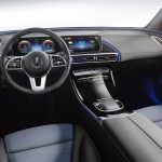À L’ intérieur, la présence de ce large écran tactile confirme la présence du système MBUX, mais dans ce cas-ci, plusieurs applications uniques au modèle EQC sont intégrées pour la première fois à un modèle Mercedes-Benz. Les designers ont également cherché à différencier le modèle grâce à une planche de bord exclusive, du moins au niveau des buses de ventilation puisque plusieurs commandes sont empruntées aux modèles à essence de la marque.